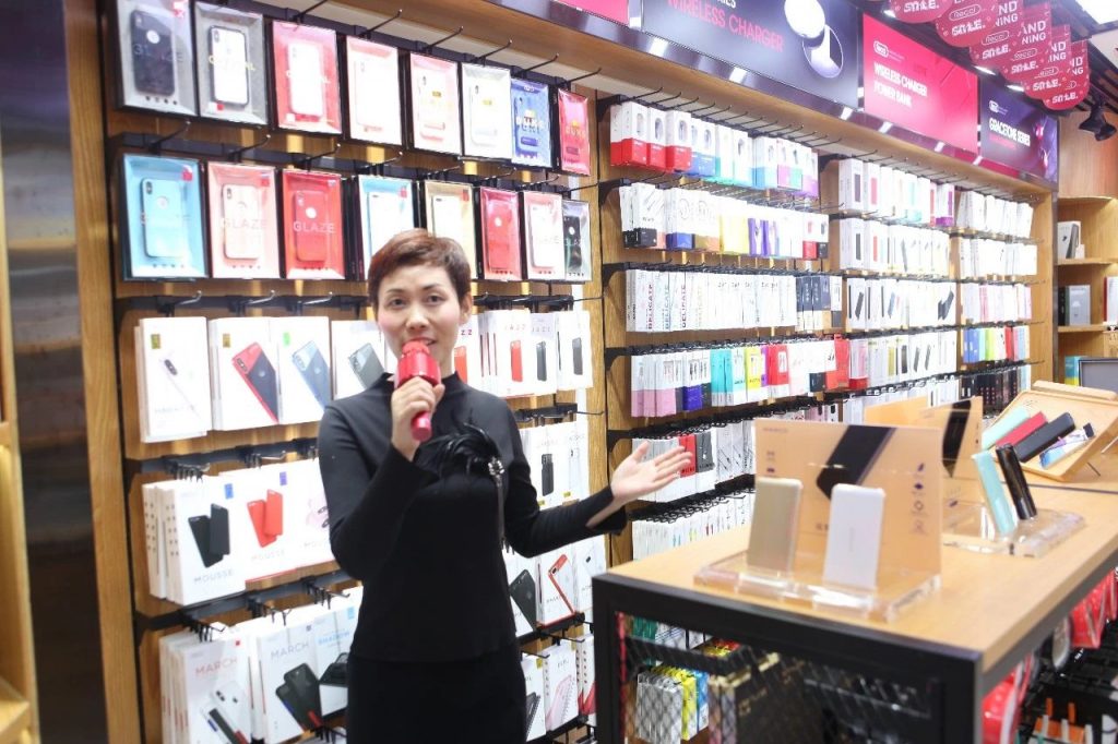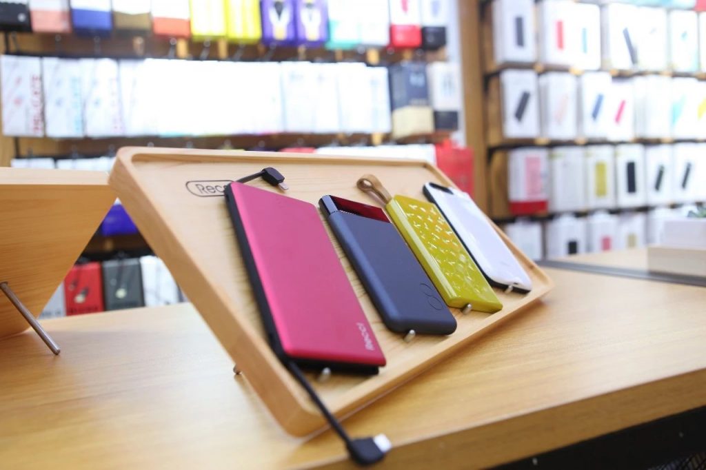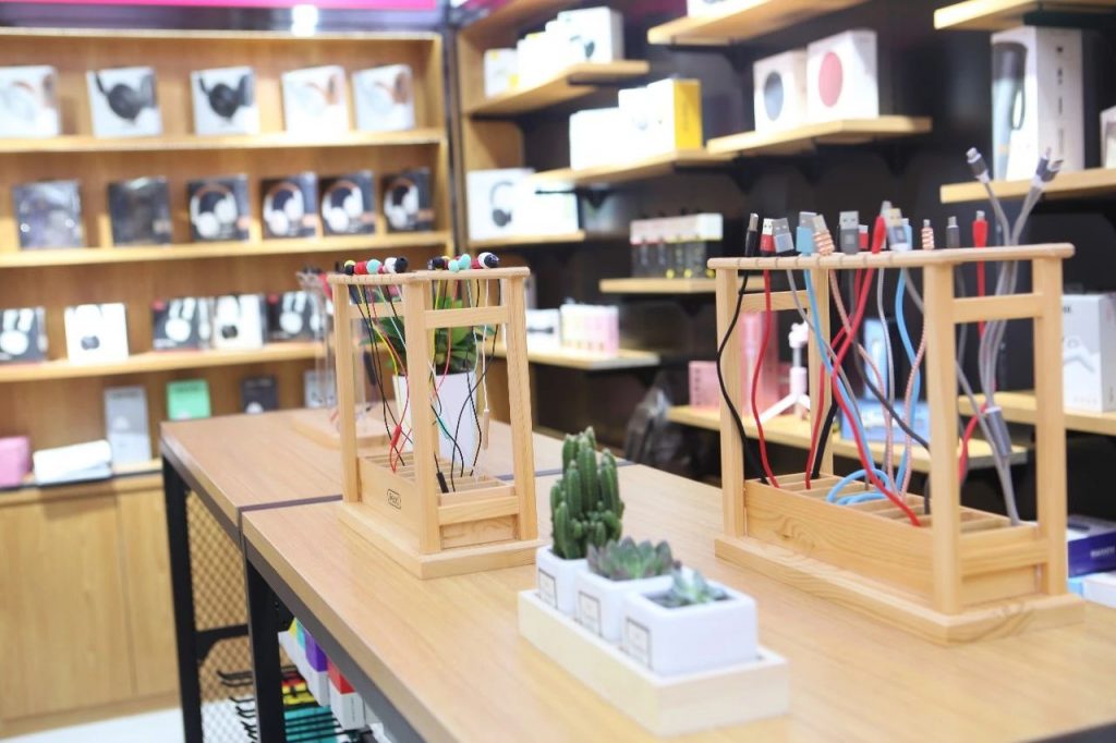 而在店内中间挂有锐思新潮时尚各样数据线、充电器等,能够满足海外市场不同充电标准的需求。