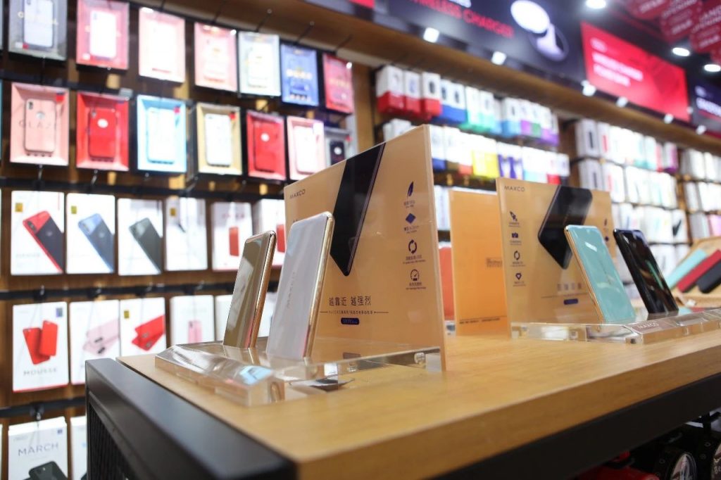 在进店左手边,可以看到悬挂着的各种钢化膜、保护壳、数据线、充电器、移动电源、