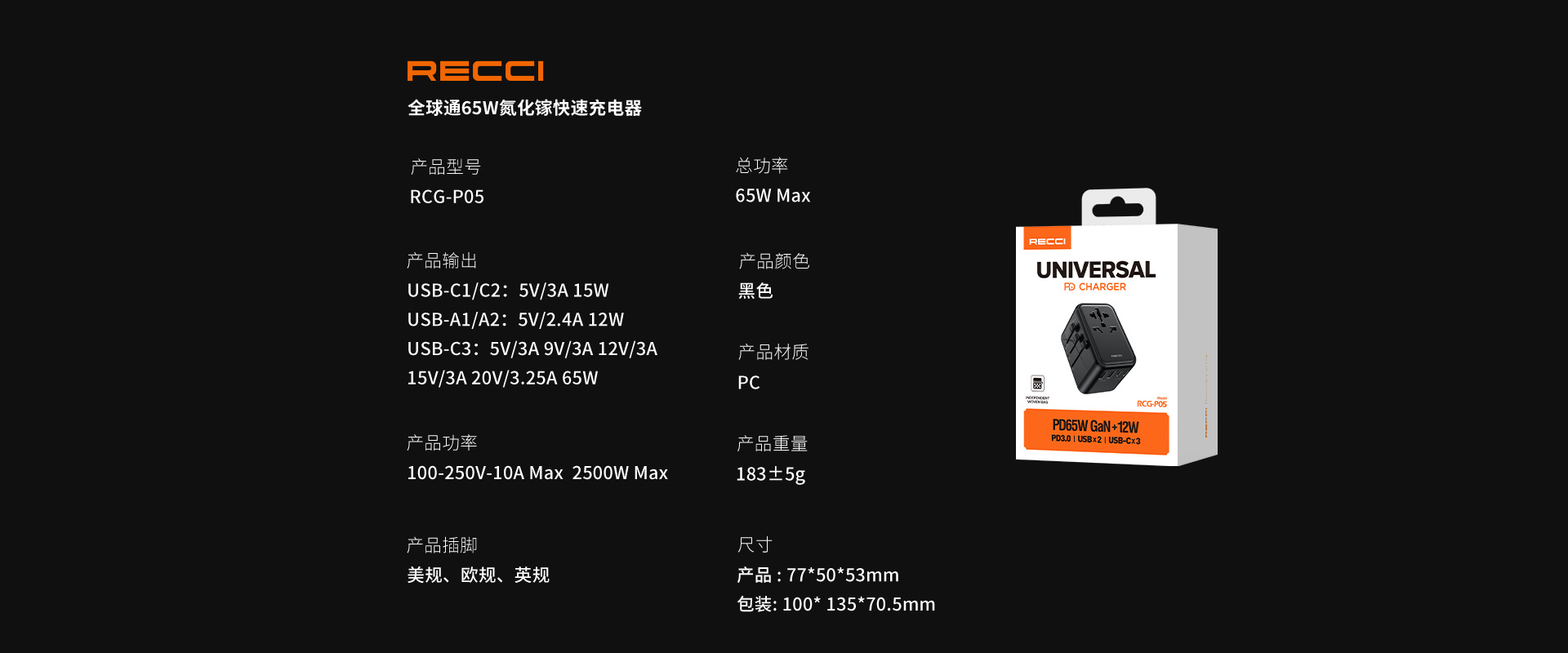 全球通65W氮化镓快速充电器